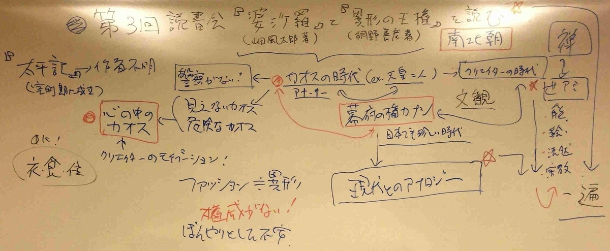 南北朝時代というと現代との隔たりが激しすぎ、アナロジーを見ることは難しい。そういいながら、「混沌」「権力の不在」という抽象的なアナロジーは参加者に共通で見ることができた。